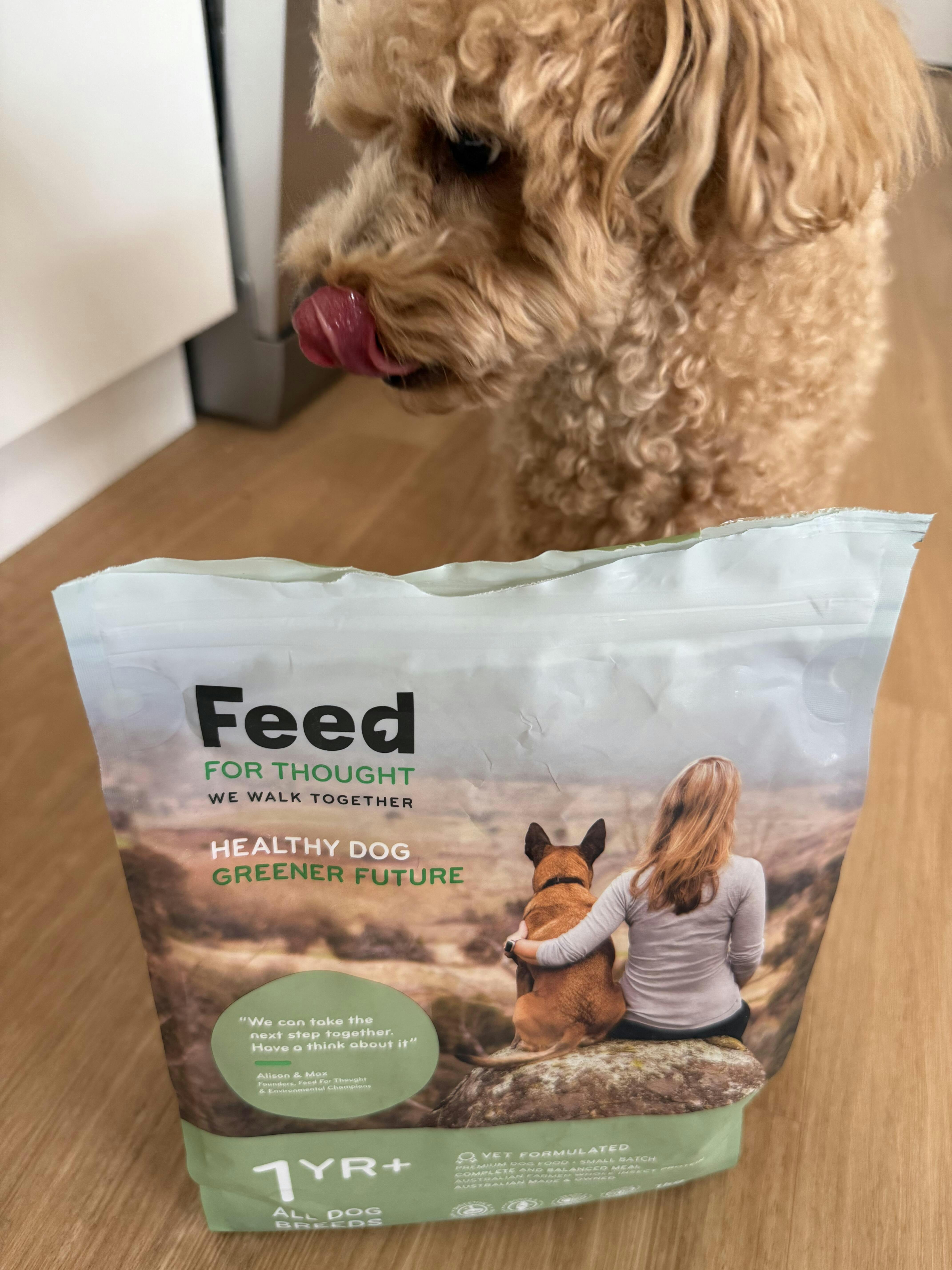 Dog eating from a bowl of Feed For Thought food next to a 1kg bag of Feed For Thought dry dog food on a rock.